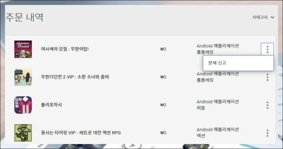 유료든 무료든 상관없이 전체 이력을 한눈에 살펴볼 수 있어요. 원하는 앱을 찾았다면 항목 오른쪽 끝에 있는 점 세 개 모양의 아이콘을 눌러보세요.