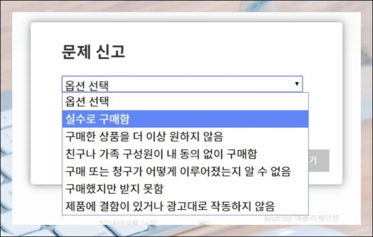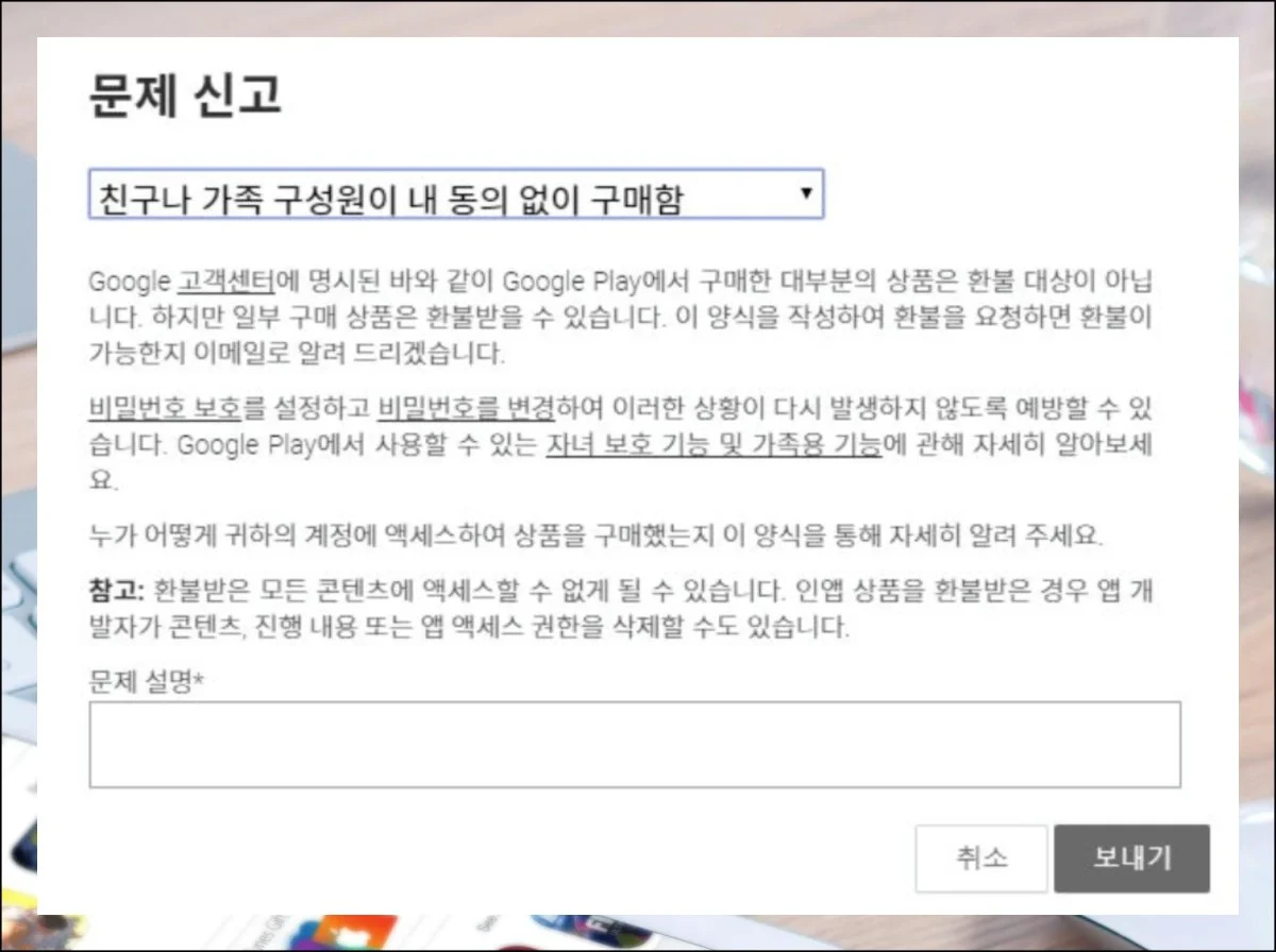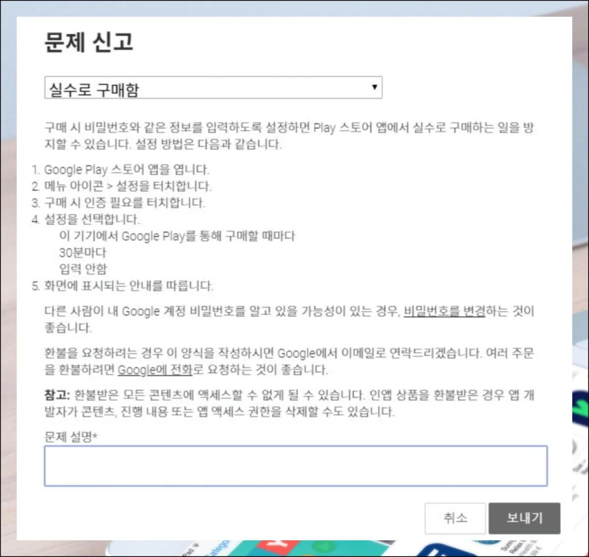 하단의 문제 설명란에는 환불을 원하는 구체적인 배경을 적어 넣으시면 됩니다. 대상이 여러 개라면 플레이스토어 고객센터에 직접 문의하는 쪽이 더 효율적일 수 있어요.