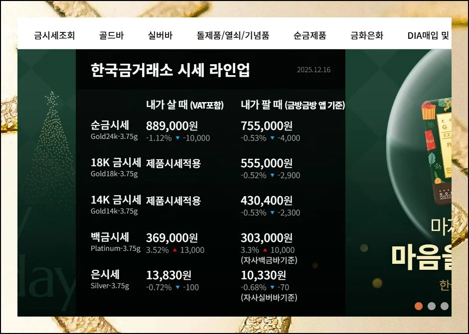한국 금거래소 홈페이지에 접속하면 메인 화면에서 실시간 금시세를 즉시 볼 수 있어요. 순금뿐 아니라 18K, 14K, 은 등 여러 귀금속 금액이 정리되어 있습니다.