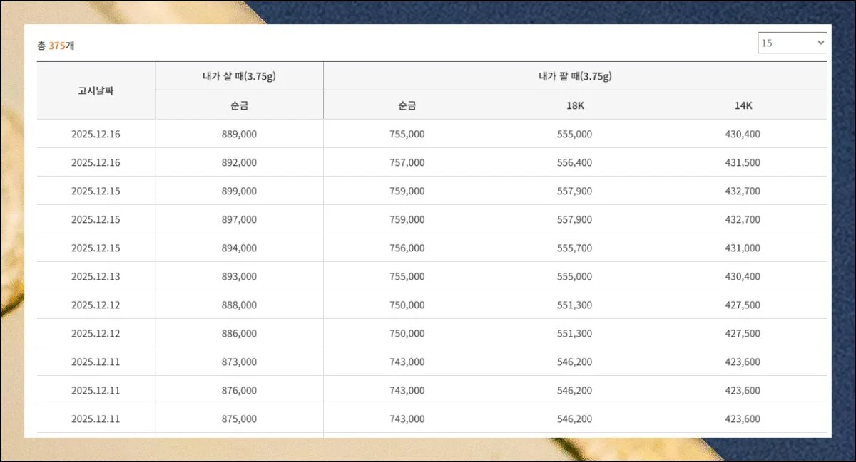 모든 금액 표시는 1돈을 기준으로 하는데요. 1돈은 무게로 따지면 3.75G이며 거래소에서 표준으로 쓰는 단위입니다.
