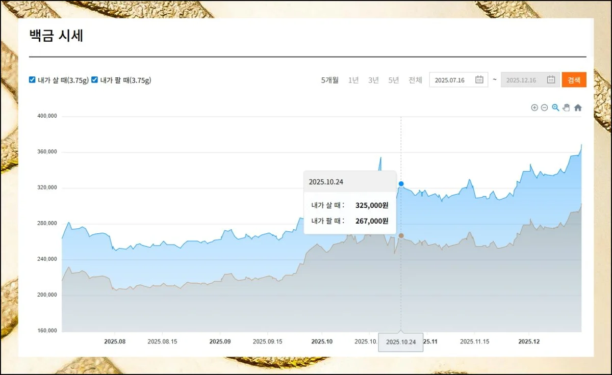 백금 가격은 최근 소폭 내렸지만, 장기간으로 보면 상승 패턴을 보이고 있어요. 백금 역시 1돈당 3.75G을 기준으로 금액이 표시됩니다.