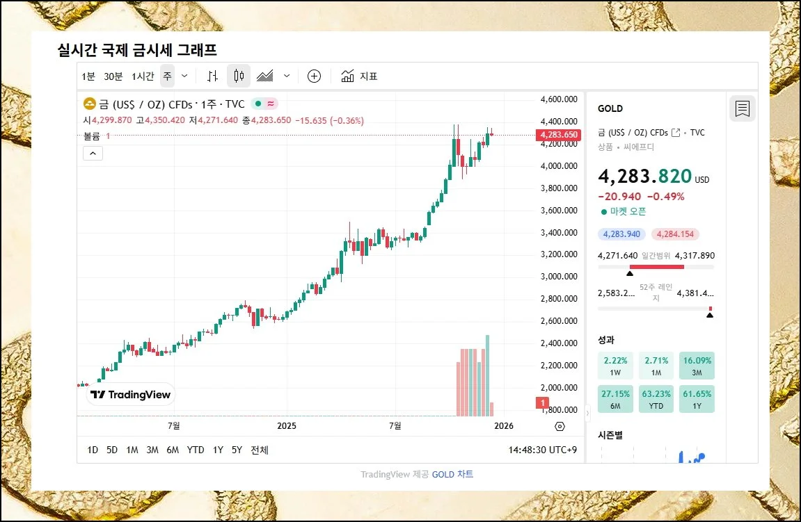 트레이딩뷰가 제공하는 국제 금 차트를 통해 세계 시장의 실시간 움직임을 알아볼 수 있어요.