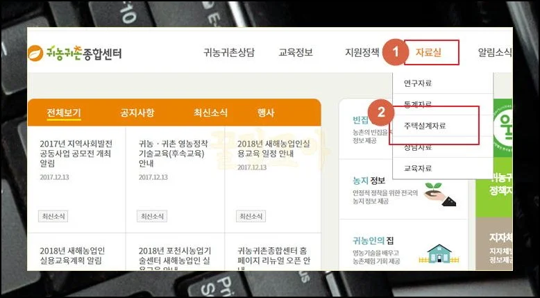 사이트 접속 후 화면 위쪽 메뉴에서 자료실 항목을 클릭해보세요. 자료실에는 농가주택과 연관된 각종 문서들이 정리되어 있습니다.
