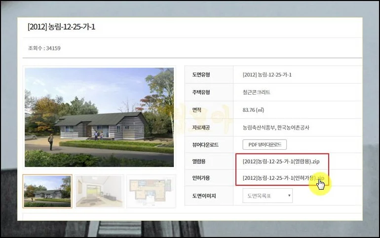 실제 완성된 농촌주택 사진과 함께 두 종류의 파일을 다운로드할 수 있는 페이지가 나타나요. 열람용과 인허가용으로 구분해서 제공되며, 전체 파일들은 압축 상태로 저장되어 있습니다.