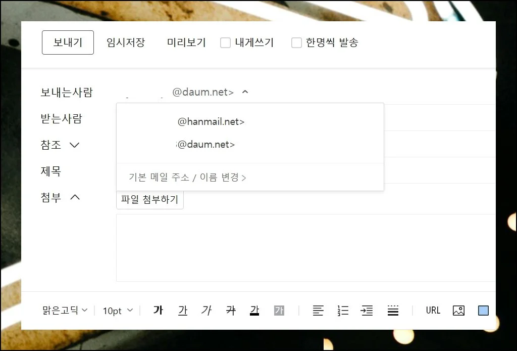 내게쓰기는 자기 자신에게 메일을 보내는 기능입니다. 위쪽에 있는 체크박스를 눌러보세요. 발신자 데이터가 저절로 화면에 뜹니다.