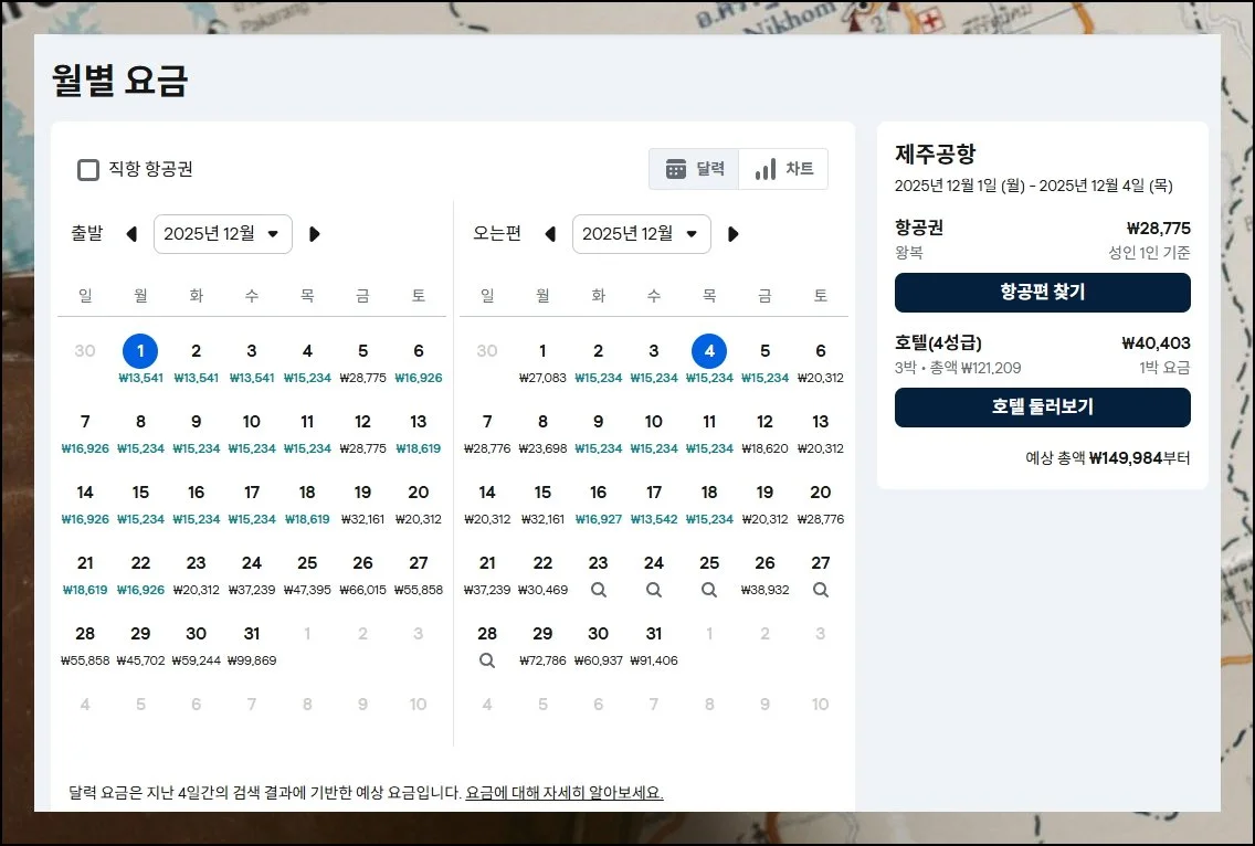 이런 방식으로 검색하면 가장 저렴한 일정을 쉽게 찾아낼 수 있죠.