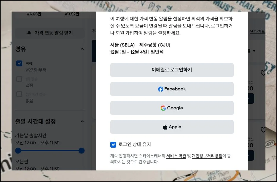 이 기능을 사용하려면 회원 가입이 필요하지만 페이스북이나 구글 계정으로 간단하게 연동할 수 있습니다. 국내선뿐만 아니라 해외 노선까지 지속적으로 땡처리 정보를 모니터링할 수 있죠.
