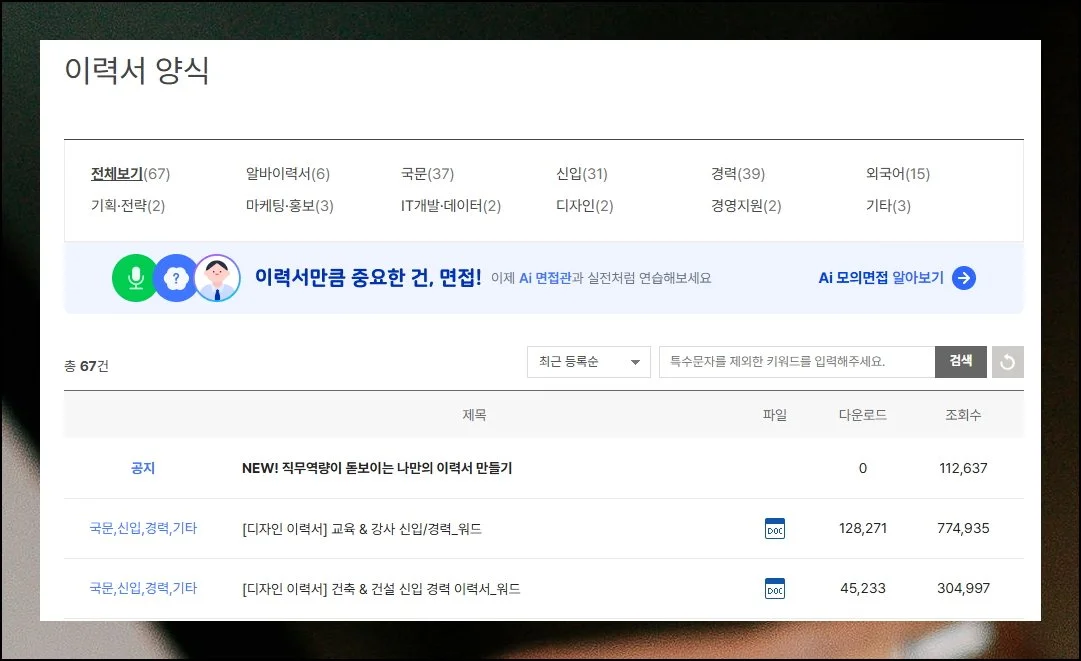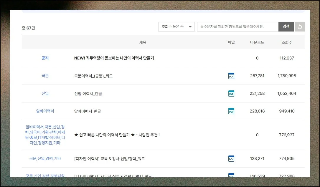 많은 구직자가 실제로 활용한 검증된 서류를 선택하는 게 좋아요. 조회수와 다운로드 횟수를 참고하면 인기 있는 템플릿을 쉽게 발견할 수 있습니다.