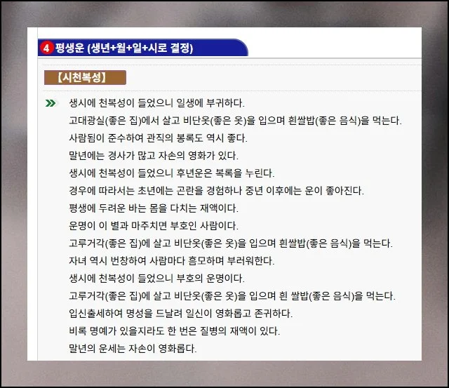 당사주에서는 인생의 여러 분야별로 나뉜 해석을 상세하게 확인할 수 있는데요.