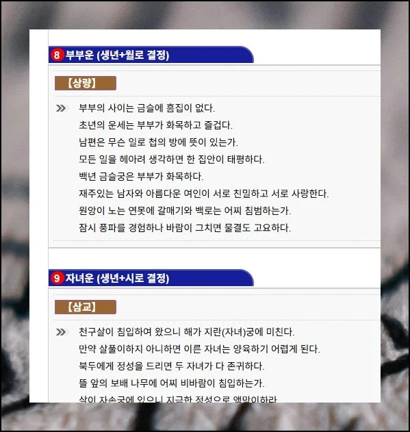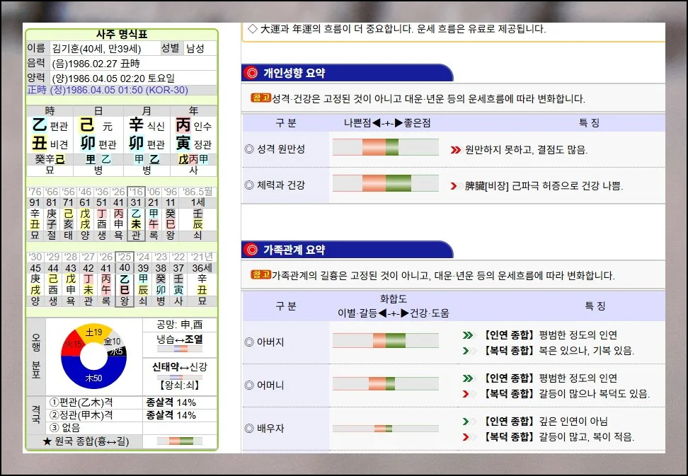 형제와의 인연, 배우자와의 관계, 자녀, 건강 상태, 마음가짐 등을 살펴볼 수 있어요. 거기에 더해 직업, 승진, 수명, 집안까지 세세하게 분류되어 있습니다.