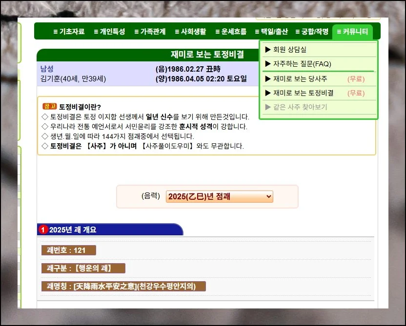 [커뮤니티] 영역으로 이동한 뒤 [재미로 보는 토정비결]을 눌러보세요. 2025년뿐만 아니라 그 다음 해, 또 그 이후 연도까지 모두 무료보기 가능해요.