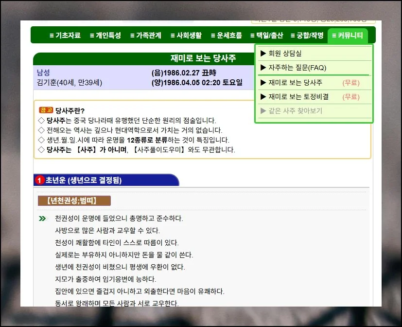태어나서 죽을 때까지의 길흉을 알고 싶다면 [재미로 보는 당사주] 메뉴를 선택하세요.