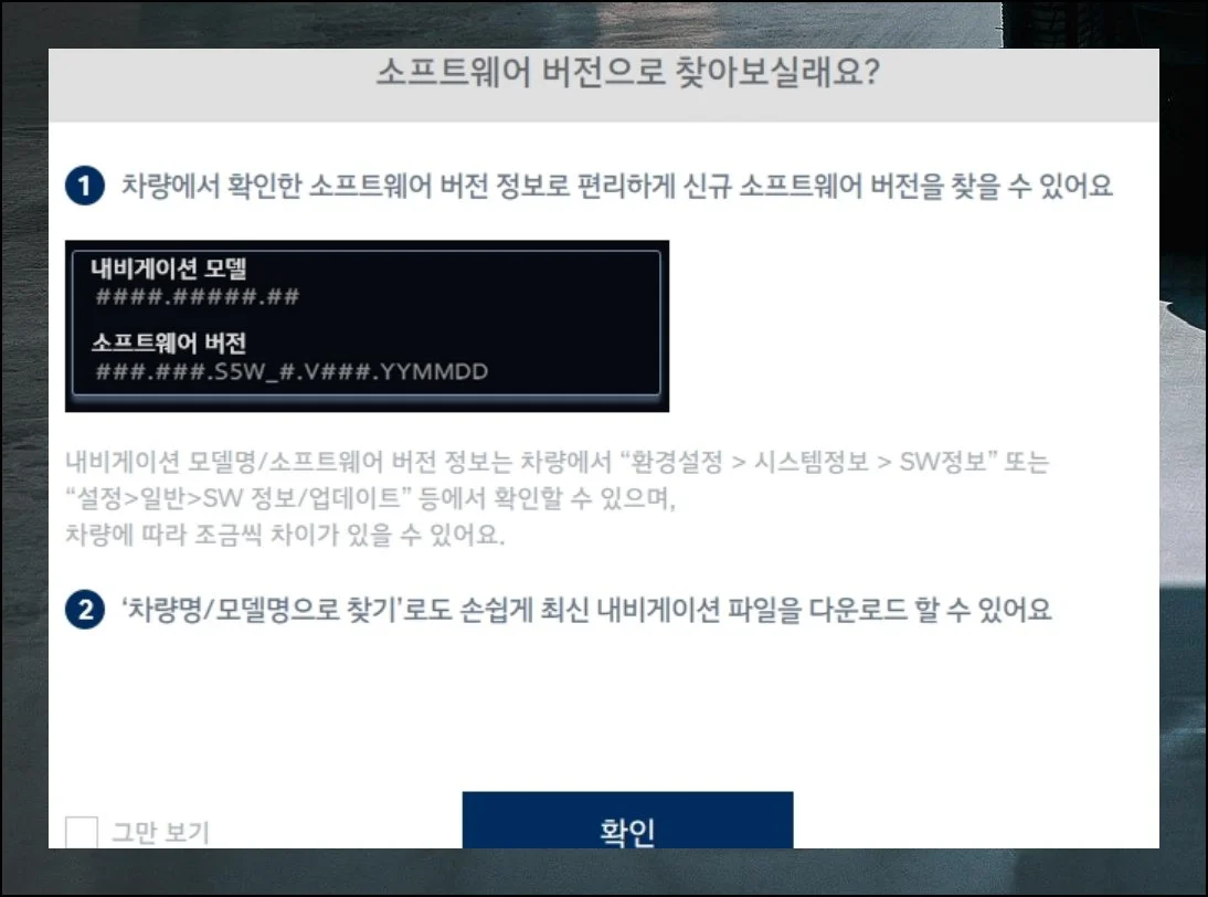 본인 차량의 정보를 입력하거나 현재 소프트웨어 버전으로 찾아보세요. 해당하는 차종을 선택하고 저장 위치만 지정하면 됩니다.