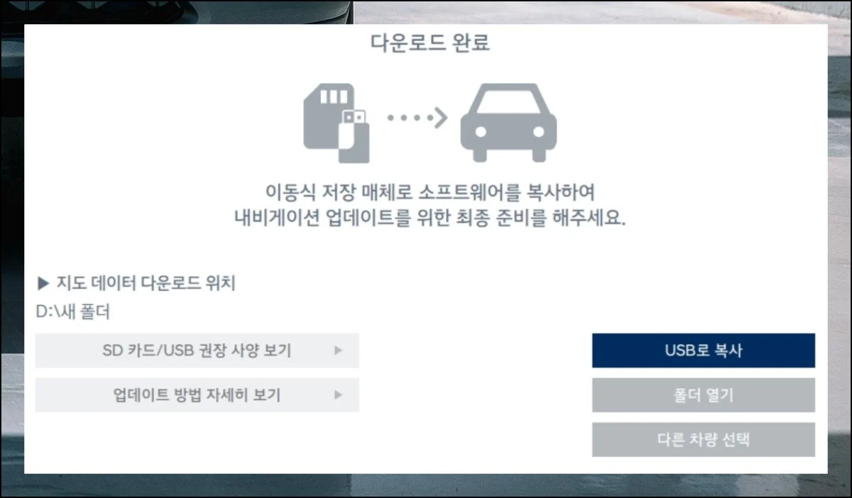 다운로드는 인터넷 환경에 따라 5분에서 10분 정도 걸려요. SD카드에 복사가 끝나면 차량에 카드를 꽂으세요.