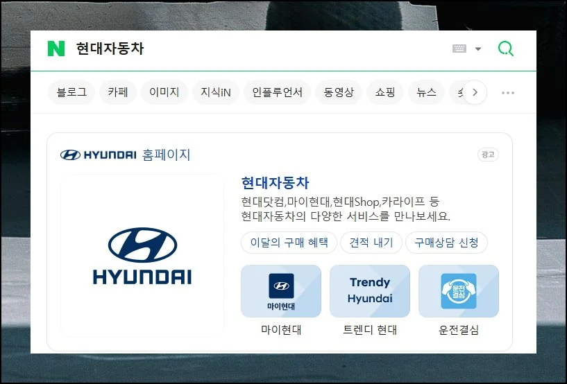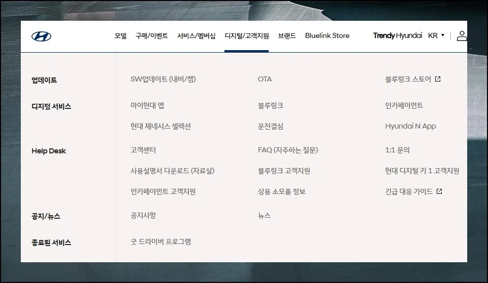 현대자동차 공식 사이트에 접속하세요. 화면 왼쪽을 보면 여러 메뉴가 나열되어 있어요.